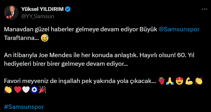 “An itibariyle Joe Mendes ile her konuda anlaştık. Hayırlı olsun. 60. yıl hediyeleri birer birer gelmeye devam ediyor.”